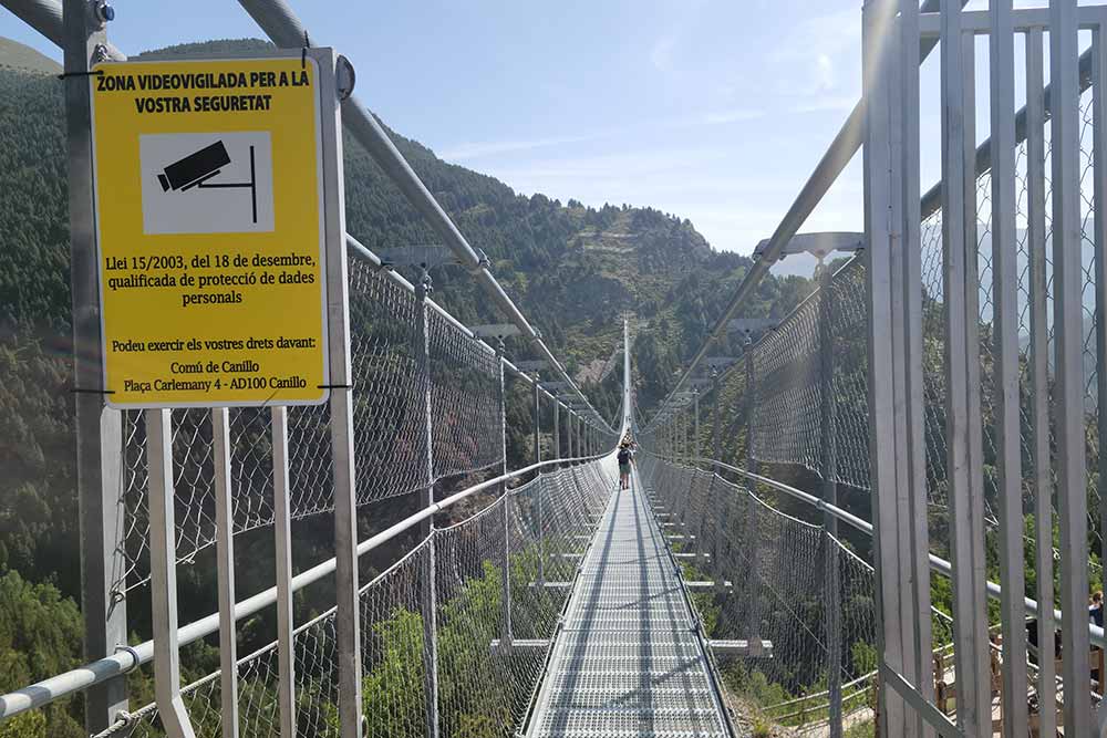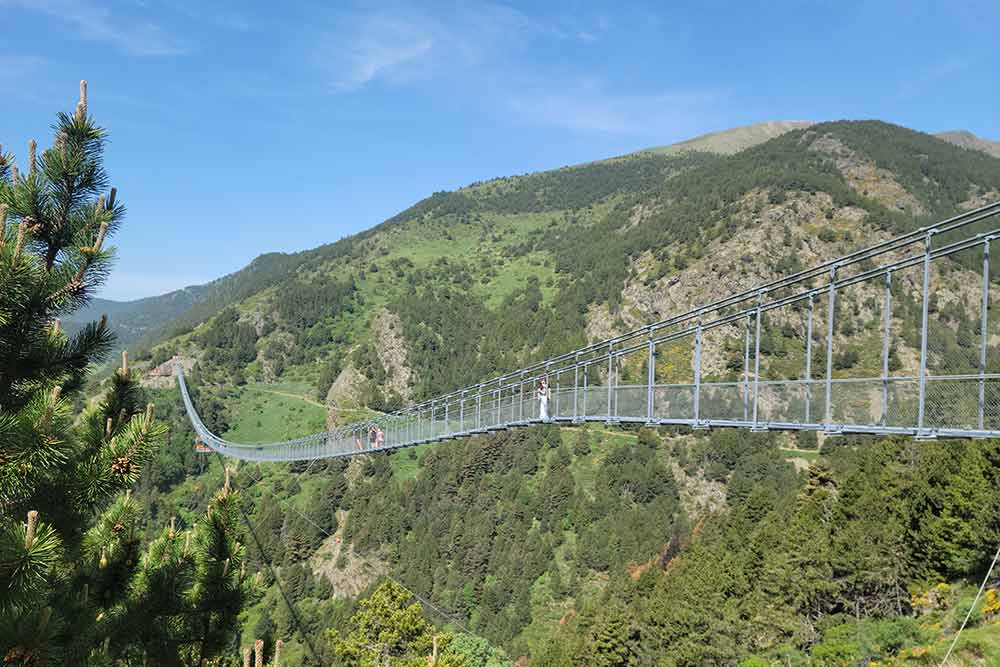 Si la vallée de l’Incles est large, il n’en va pas de même pour celle du Riu. On l’atteint après plusieurs kilomètres d’une route agréable et d’une courte marche. Là, on se trouve à 1 875 m d’altitude. Un pont de 603 mètres de long et large d’un mètre* permet de relier les deux côtés de la vallée. Le pont tibétain de Canillo est le deuxième plus long d‘Europe. Unique, il est situé dans l’un des sites naturels les plus spectaculaires de la Principauté. L’emprunter requiert un certain courage. Sous ses pieds, on aperçoit le Riu. Sur les côtés, le vide. Il faut aussi compter avec le vent… Aucune inquiétude réelle cependant. En effet, cette spectaculaire structure métallique suspendue par quatre câbles au-dessus du vide est bien sécurisé avec de hautes rambardes. Pour autant, on prend un bon shoot d’adrénaline en le traversant. Et ce n’est pas fini.