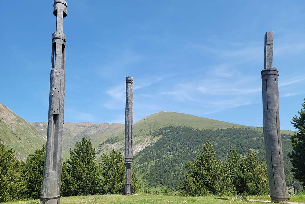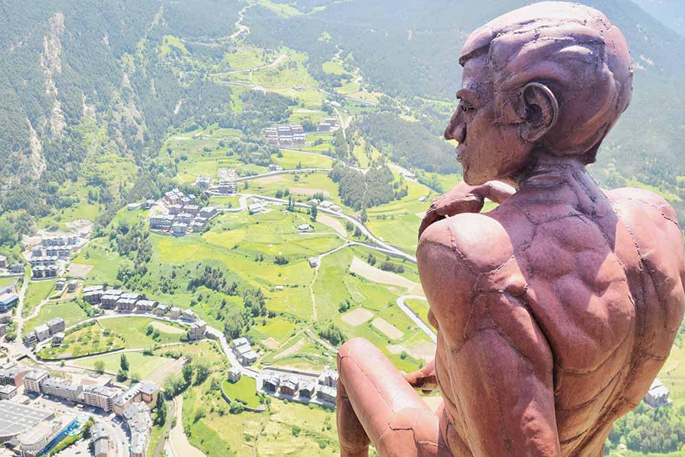 Autre shoot d’adrénaline au Roc el Quer. Quand on est à Canillo et qu’on lève les yeux vers les sommets, on aperçoit un promontoire que défie le vide. Il s’agit du « Roc el Quer« , construit en 2016, au col d’Ordino. On y accède après une courte marche. Elle commence par un ensemble sculptural de trois totems symboles de la « volonté de l’homme face à l’immensité de la montagne ». D’abord, un premier belvédère permet d’observer la vallée. Ensuite, un promontoire*s’élance au-dessus du vide. 500 mètres de gaz sous ses pieds ! La vue est époustouflante. Devant soi, Canillo et les montagnes. De l’autre côté de la route l’Andorre. Une étrange statue, due à l’artiste Miguel Ángel González, borde la passerelle. Un penseur calme et réfléchi, assis sur une poutre, indifférent à l’altitude.