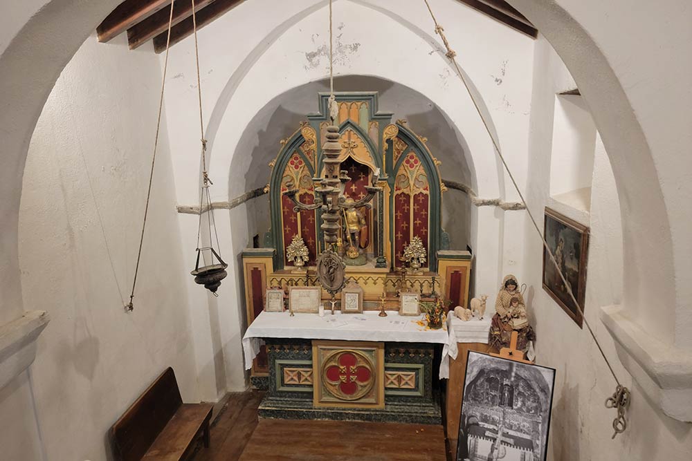 Ce Christ en majesté (sur le mur à droite) a été retrouvé dans des décombres de la chapelle.