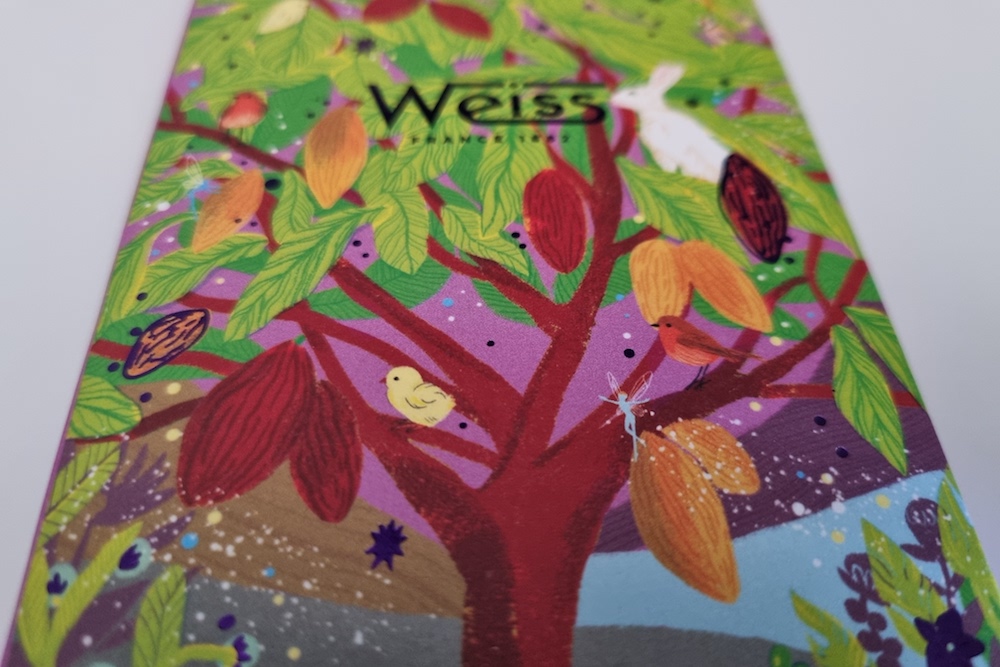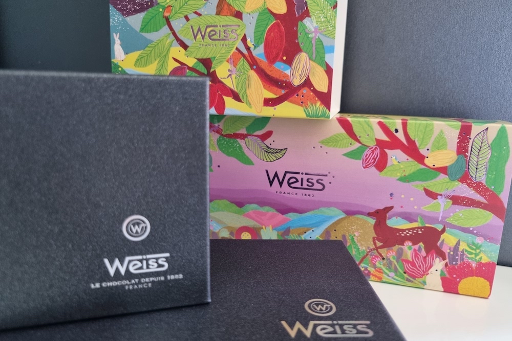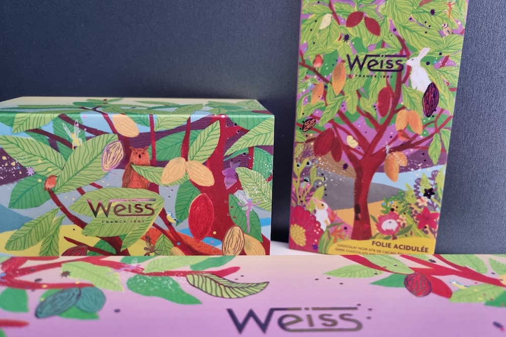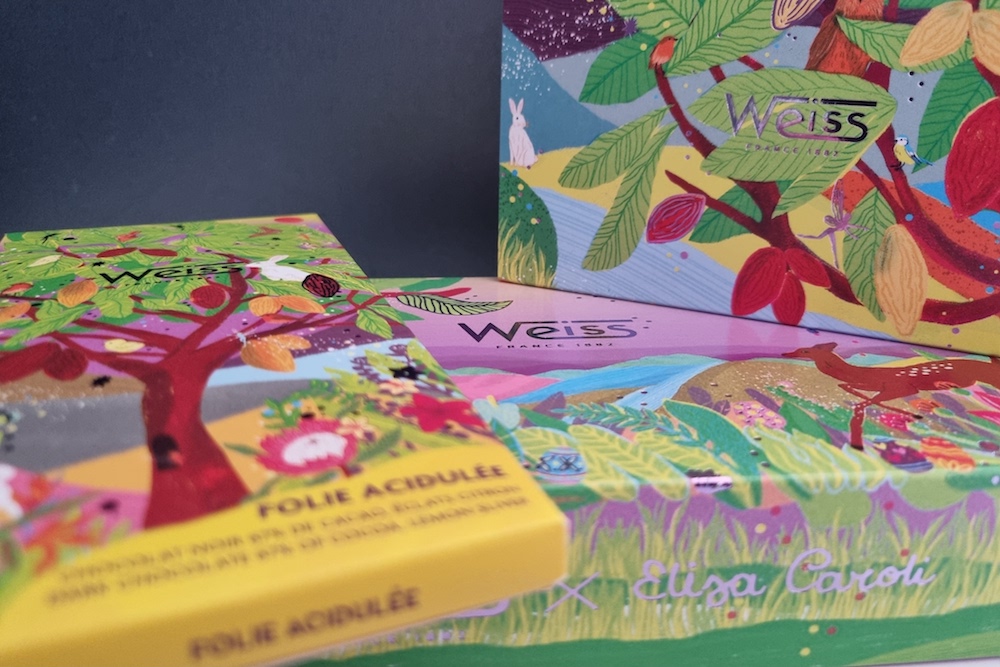 Folie Acidulée, Coffret Enchantement Cacaoté et Ballotin Forêt enchantée. La collection de Pâques signée Weiss est ainsi composée de trois créations illustrées par Elisa Caroli. On y trouve une tablette de chocolat noir 67% aux éclats de citron (recette exclusive), un coffret d’assortiment d’œufs et de fritures ainsi qu’un ballotin de lapins et de cloches en chocolat et cœur praliné.