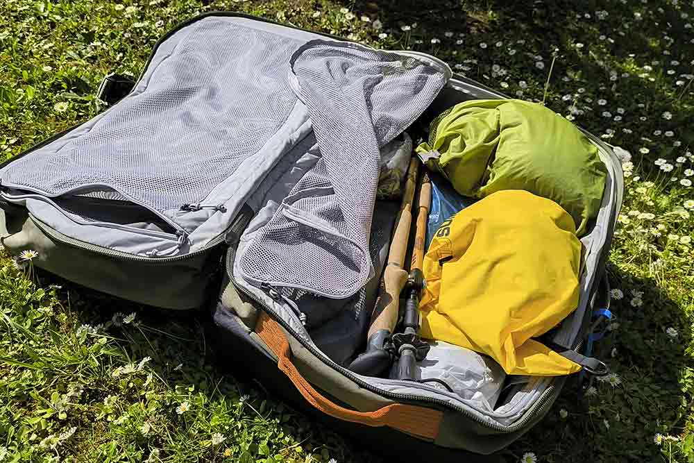 S’ouvrant en portefeuille, le sac Fjällraven Färden 75 roller est organisé de manière simple. A l’intérieur, vous disposez de deux compartiments. Celui situé dans la partie inférieure de la coque rigide est légèrement plus grand que l’autre. En revanche, celui du dessus comporte une grande poche en mesh qui laisse apparaître son contenu. Le moindre détail a été étudié. Les différents zips qui ouvrent et ferment l’ensemble sont munis de languettes qui fonctionnent à double sens. En revanche, il n’y a pas de poche supplémentaire à l’intérieur et à l’extérieur.