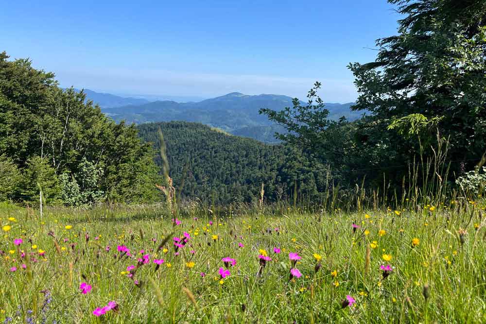 Côté terre, dans les Hautes-Vosges, plus de 350 kilomètres de randonnée s’offrent à vous. Vous pourrez par exemple arpenter gentiment la Chaume du Drumont qui offre de jolis points de vue sur le Grand Ballon et le Ballon d’Alsace. L’occasion d’observer aussi son incroyable richesse botanique : pensées des Vosges, gentianes, renouées bistorte, oeillets des Chartreux… En octobre, le spectacle des feuillages est, paraît-il, époustouflant.