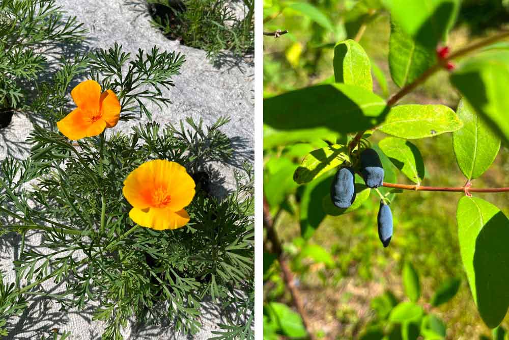 Escholtzia (ou pavot de Californie). A droite, des camerises au goût sucré et acidulé
