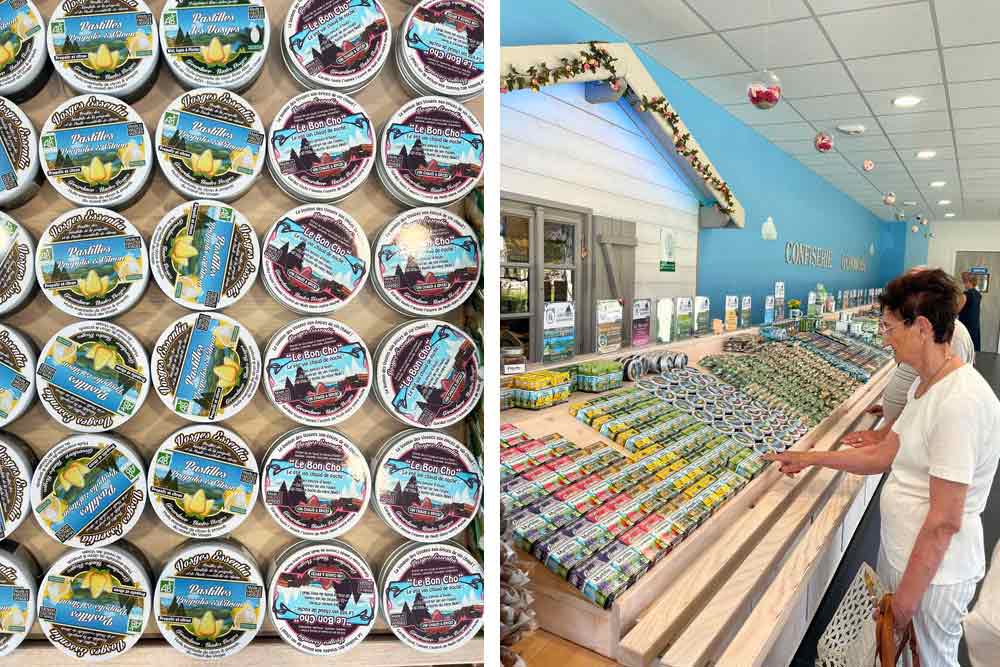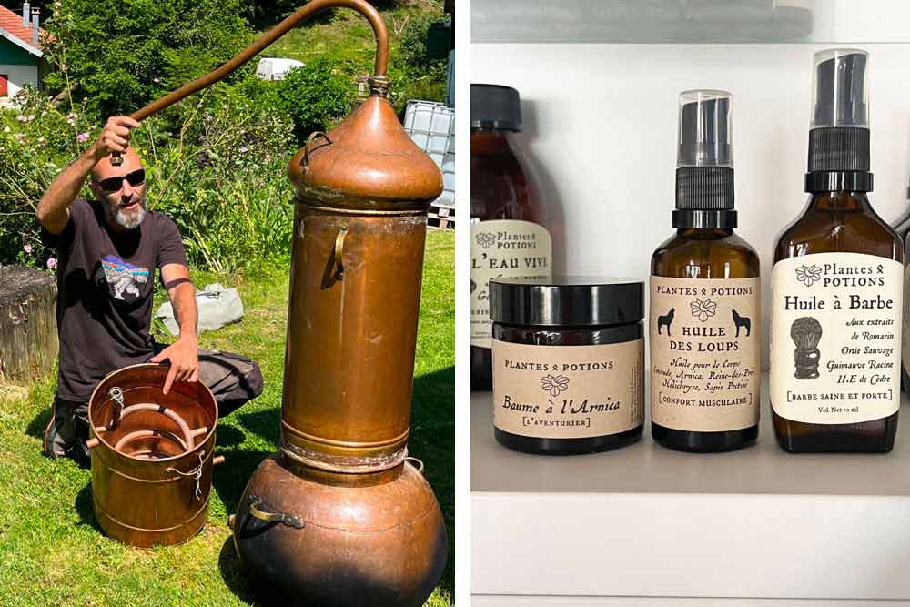 Ce couple de paysans herboristes qui n’a pas toujours vécu dans les Hautes-Vosges, a autant de science que d’humour et de poésie. En redescendant au village, dans leur magasin, on tombera sous le charme de leurs flacons et sachets : les tisanes Velours, Voyageuse ou Gambettes. L’huile des Loups, l’huile à Barbe… Ces hydrolats, eaux florales, macéras ou autres alcoolatures, entièrement bio, sont aussi issus de cueillettes sauvages. Fabriqués selon des procédés ancestraux et des méthodes d’extraction douce, ils soignent tous les maux du corps et de l’âme !