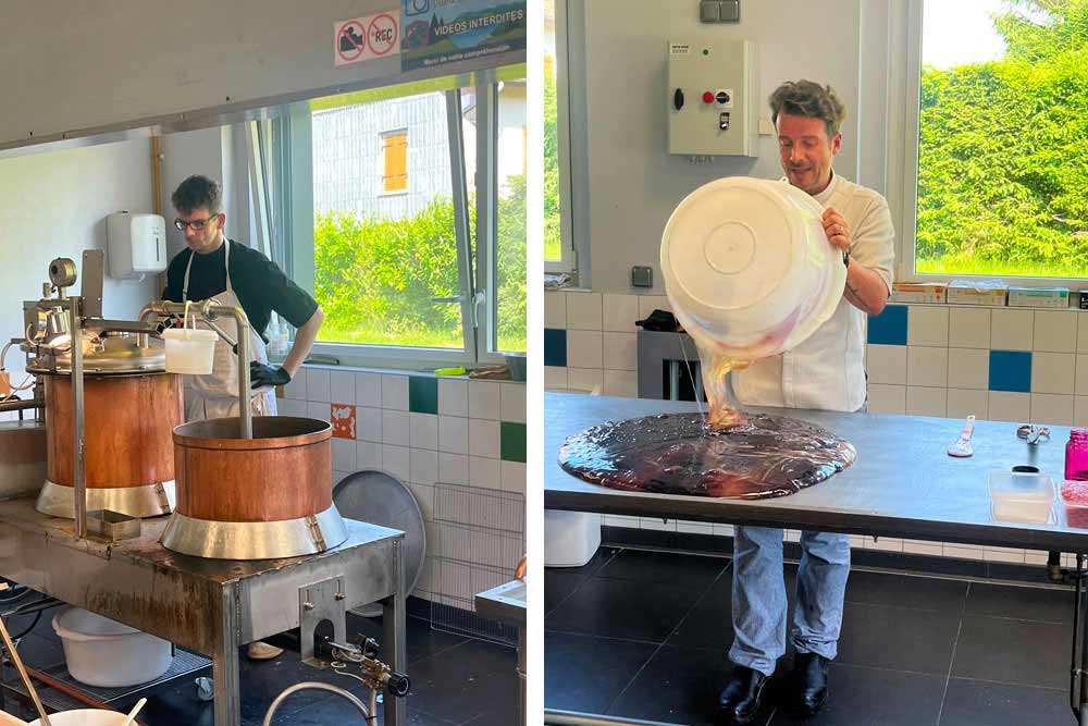 Soyons gourmands maintenant et filons chez les frères Wexler ! Il y a dix ans, Justin et Manuel ont tout quitté pour monter ensemble cette confiserie vertueuse. Tous les bonbons y sont bio, fabriqués à partir de produits naturels tels que le miel, la gomme d’acacia ou les huiles essentielles… Les observer travailler sur leurs machines « vintage » est un vrai plaisir. Pour des bonbons à la myrtille par exemple, de l’eau, du sucre, du sirop de glucose et un arôme de myrtille (donné à 95% par des fruits) composent une grosse pâte translucide qui sera malaxée à chaud. Pour être ensuite moulée en rubans et cassée en petits bonbons. Leur couleur violette? De la betterave, des carottes noires et du cucurma.