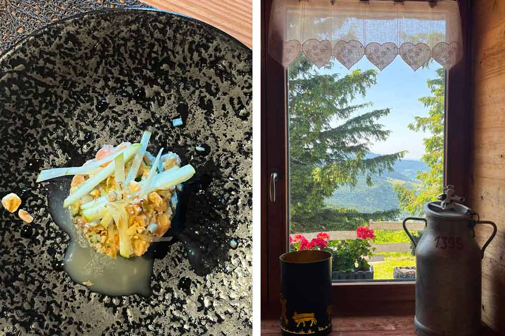 Tartare de truite au gingembre et coriandre (Dahu barbu). A droite fenêtre de la ferme auberge du Drumont.