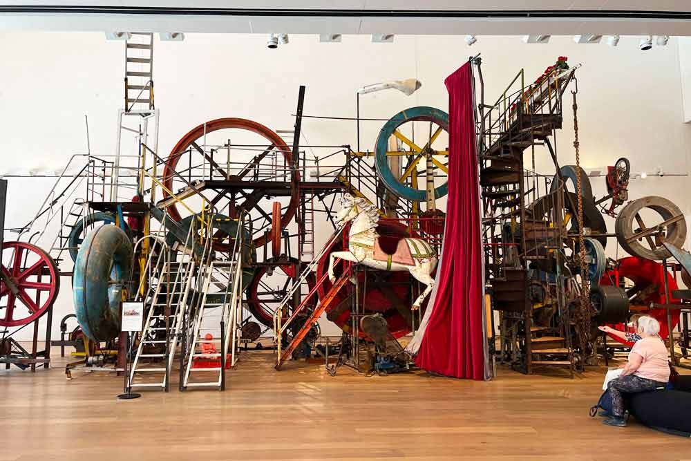 Le musée ne comporte pas, comme l’aurait souhaité Tinguely, une hôtesse à l’entrée se manucurant les ongles. Et, pour les visiteurs, des audio-guides dans une langue autre que la leur ! Il n’empêche, le lieu apporte son lot de surprises. Ainsi le Retable de l’Abondance occidentale et du Mercantilisme totalitaire, machine monumentale et colorée ajoutant à la ferraille un crâne de boeuf et toutes sortes d’objets de consommation. Elle fut exposée à Moscou l’année même de la mort de l’artiste.
