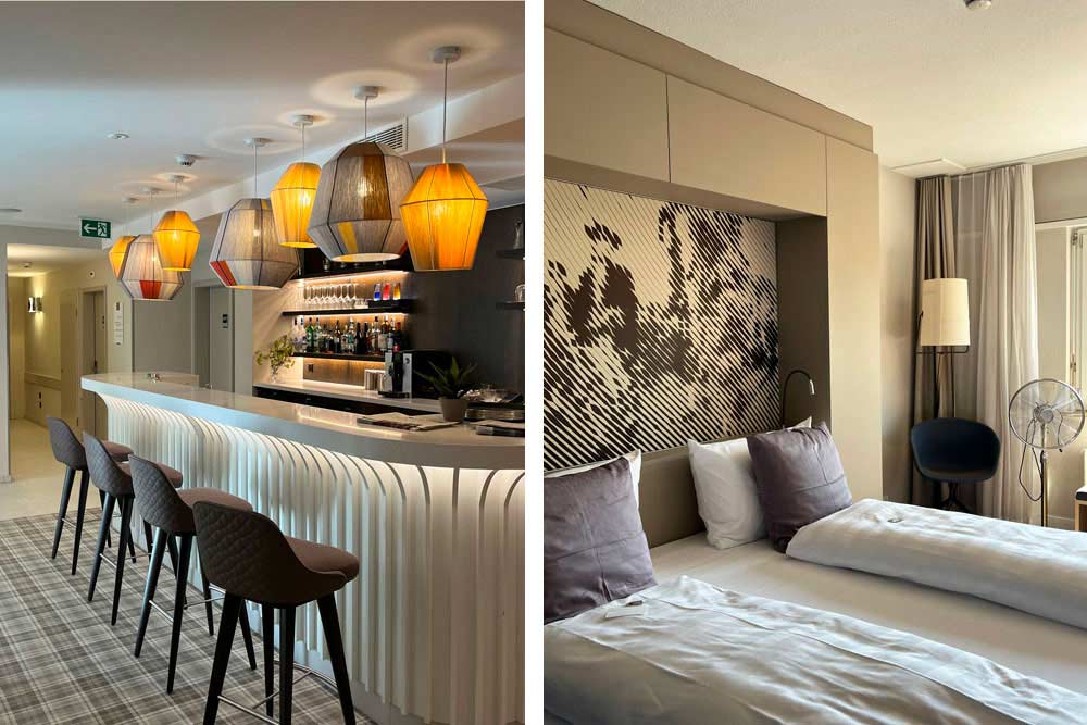 Le bar de l’hôtel Mercure, à Fribourg. A droite, chambre de l’hôtel Wettstein (Bâle)