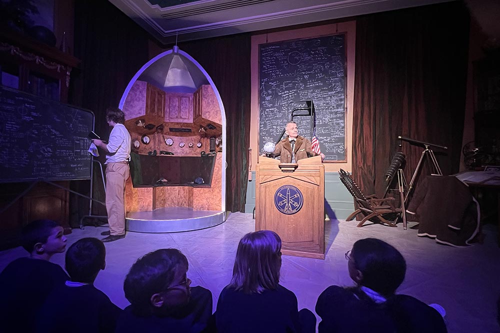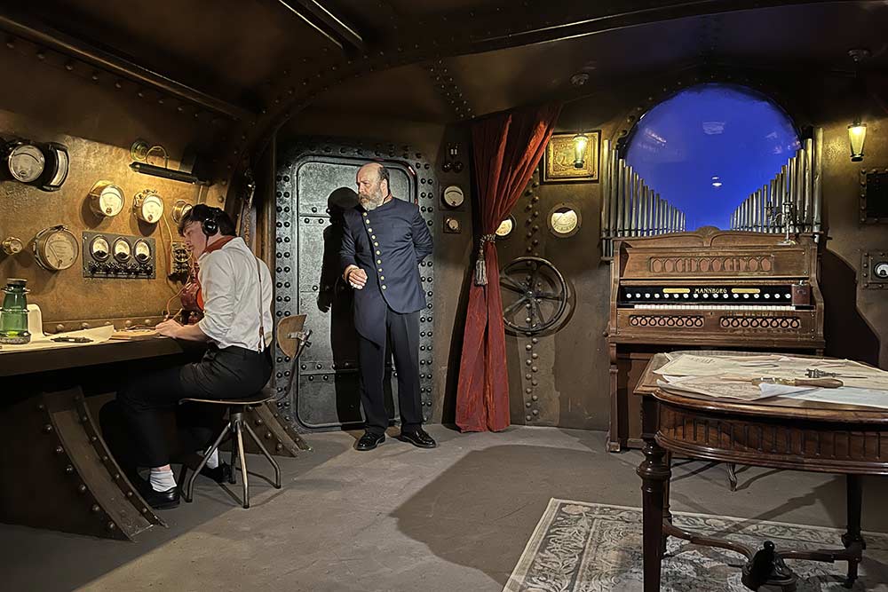Les huit magnifiques scènes qui composent ce spectacle se déploient sur plus de 1 000 mètres carrés. D’abord, c’est Jules Verne qui nous reçoit pour nous conter sa vie… puis nous pénétrons dans l’historique imprimerie où nous pouvons découvrir des presse centenaires. Etonnant également la montgolfière suspendue au plafond qui rappelle les exploits des pionniers de l’aérostation. Même le Nautilus a été reconstitué. Nous somme immergé dans les profondeurs abyssales du sous-marin du Capitaine Nemo. Ce qui rend ce spectacle encore plus passionnant, ce sont les interactions avec les visiteurs qui deviennent acteurs.