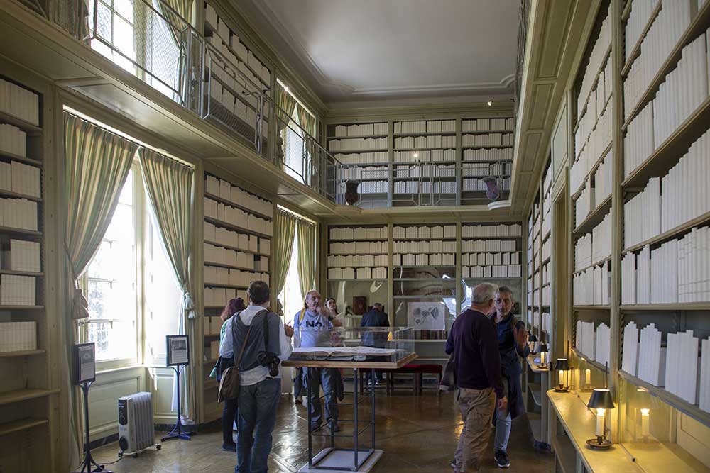 Ces travaux gigantesques ont fait suite à ceux de 1733. En effet, une entrée monumentale baroque avait été percée dans le rempart du château. Elle ouvre sur un magnifique escalier conduisant aux salons d’apparat et à une bibliothèque contenant 15 000 ouvrages. Un lieu dont la duchesse d’Enville, fille du duc Alexandre de La Rochefoucauld, souhaitait faire une pépinière de l’esprit libéral de son temps. D’où des ouvrages d’une extrême variété allant de la philosophie au voyage, de la médecine à la littérature ou encore de la théologie à la chimie. Parmi les auteurs répertoriés, Diderot, Holbach, Mirabeau, Montesquieu ou Voltaire. Aujourd’hui, seuls quelques livres demeurent. La collection a été vendue et dispersée en 1987. Elle a été remplacée par de faux livres blancs. À voir aussi la « Bibliothèque fantôme » regroupant des ouvrages d’art, des actes de colloques, des livres d’artistes, des recherches historiques. Livres en vente à l’accueil.