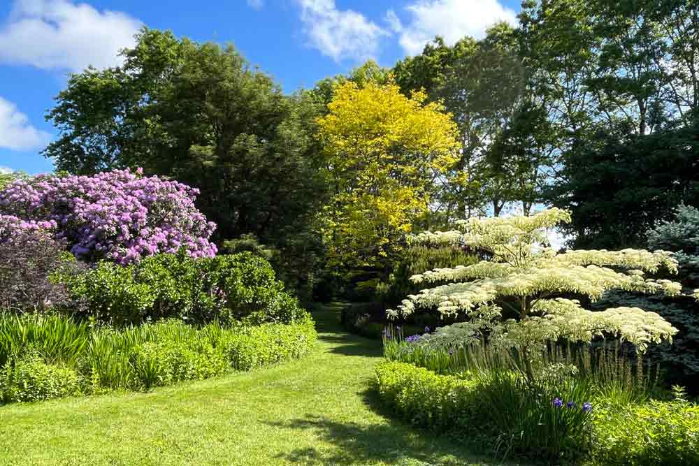 Massifs avec floraison de rhododendrons. Un vrai tableau ! (Jardins des Renaudies.