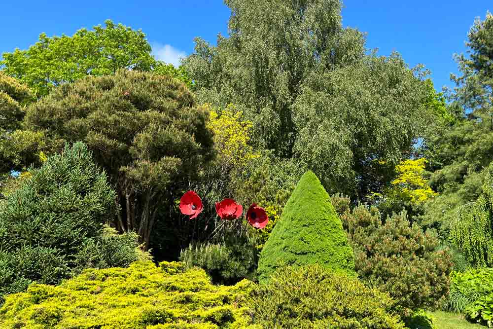 Trois sculptures de coquelicots géants animent la symphonie des verts… (Jardins des Renaudies).