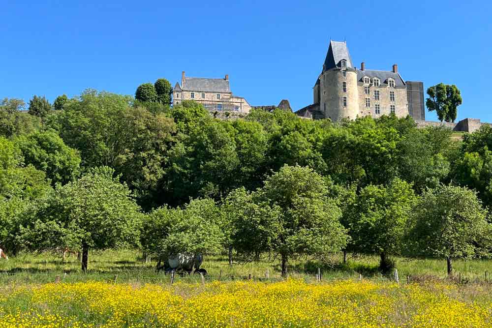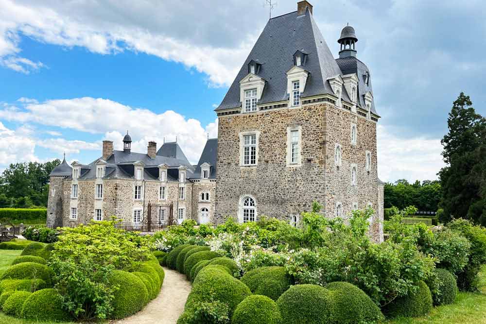 Autre site, autre histoire ! Celle-ci est aux antipodes de la précédente. C’est celle d’un château et d’un jardin de la fin du XVIe siècle, tombés dans les mains d’un couple d’aventuriers du patrimoine en 2004. Catherine et Xavier Cauchois, respectivement médecin et homme d’affaire, n’ont eu de cesse depuis, de se consacrer à leur renaissance, avec l’aide d’un paysagiste, d’une historienne des jardins. Et surtout d’un jardinier ! Le résultat est magique. Tout autour de cet adorable château en pierre de roussard (typique en Mayenne), se déploient un vaste parc et un étang. On passera tour à tour par les jardins potager, fruitier et d’agrément aux nombreux symboles religieux. Et dont les couleurs évoquent les saisons. Puis c’est une longue promenade jalonnée d’arbres magnifiques : hêtres, chênes, saules, ginkgo biloba, cyprès chauves… A chaque pas, un nouveau point de vue sur le château. Comme un mantra. Une incitation à la contemplation.