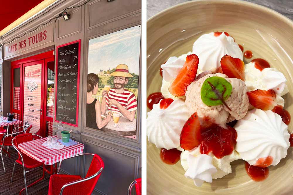 La terrasse de Caf&Couette à Sainte-Suzanne. A droite, pavlova à la fraise (Brasserie du Patio).