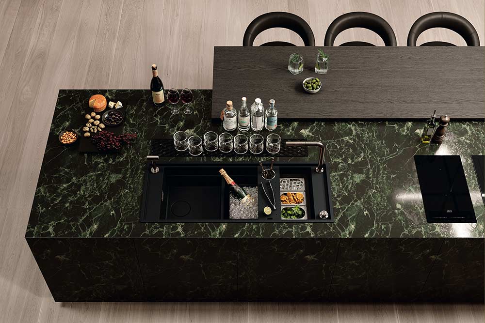 Mixology d’Elleci est un double poste de travail qui favorise la convivialité domestique. Très spacieux, il a pour avantage de combiner la partie cuisine avec celle du barman.
