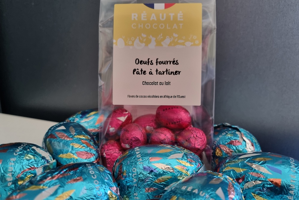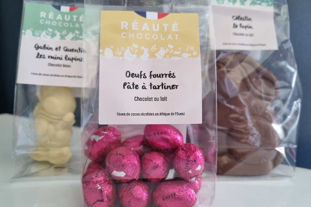 Réauté propose également Célestin le lapin. Avec ses longues oreilles et son sourire malicieux, Célestin n’est pas qu’un simple lapin : c’est LA star de Pâques, celle qui fait briller les yeux des petits et fondre les cœurs des grands. Noir, lait ou blanc, à chacun de choisir celui qu’il préfère…