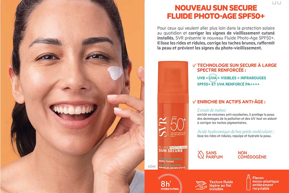 Pour aller plus loin dans la protection solaire et corriger les signes de vieillissement cutané installés, SVR vous présente le nouveau Fluide Photo-Age SPF50+. Il lisse les rides et ridules, corrige les taches brunes, raffermit la peau et prévient les signes du photo-vieillissement. Ce produit bénéficie d’une technologie Sun Secure à large spectre renforcé UVB, UVA et Visibles. Sans oublier les Infrarouges SPF50+ et UVA renforcé PA++++. Il est enrichi en actifs anti-âge avec on extrait de melon qui contient des enzymes anti-oxydantes. Mieux, il protège la peau des dommages de la pollution et des UV. Il aide aussi à corriger les taches pigmentaires grâce à l’acide hyaluronique de bas poids moléculaire qu’il contient. La peau est repulpée et hydratée.