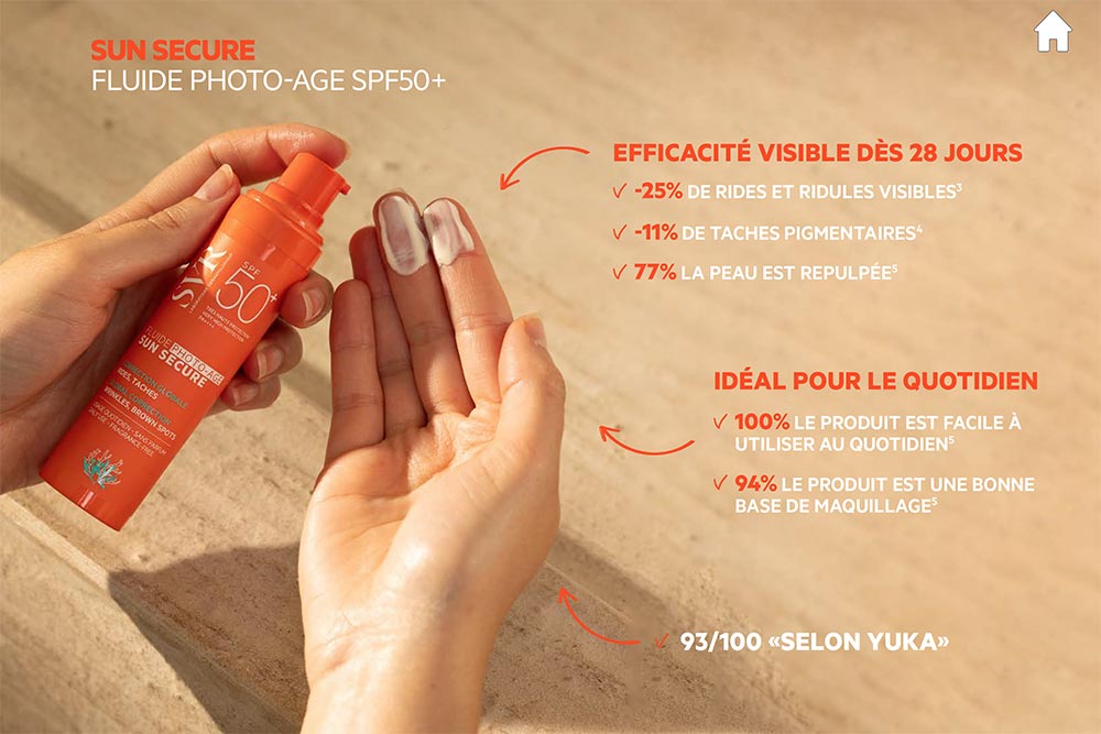 Ces tests prouvent que Sun Secure protège la peau au niveau du derme. Plus de dégradation de la fibrilline. La production de MMP-1 est limitée. La peau et sa souplesse sont préservées. Au niveau du derme et de l’épiderme, la production de -MSH est réduite. Tout risque d’hyperpigmentation est stoppé.
