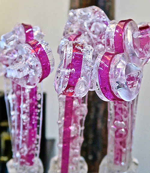 Originaire de Vallauris, Cristina Marquès, toute petite, aimait visiter les ateliers des céramistes de sa ville. Elle se laisser emporter par la magie de la terre qui se transforme sous les gestes adroits des potiers; plus tard, étudiante à paris, elle découvre la peinture, la création de décors et le verre acrylique (Altuglas, Plexiglas). A son tour, comme les potiers de son enfance, elle se met à dompter, à détourner, à magnifier le matériau ingrat. Puis elle crée des bijoux contemporains avec du méthylacrylate, peint le Plexiglas, et lui apporte des effets « bulge » ou « trompe l’oeil ». Récompense : une médaille d’Argent au Concours Lépine en 2004. Elle retourne ensuite dans son chez Sud où elle perfectionne sa technique. La Place nous présente les météorites de l’artiste : des spirales à la fois glaciales et brûlantes. Ensorcelantes.